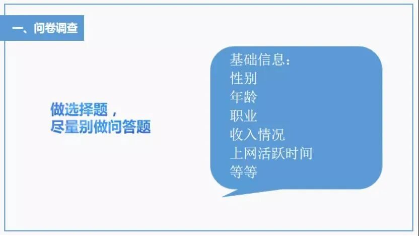 当你对你的用户一无所知的时候,问卷调查是一个比较好的方式,通过问卷调查,可以让我们对用户有一个大概的了解,比如:性别、年龄、职业、收入情况、上网活跃时间等等。