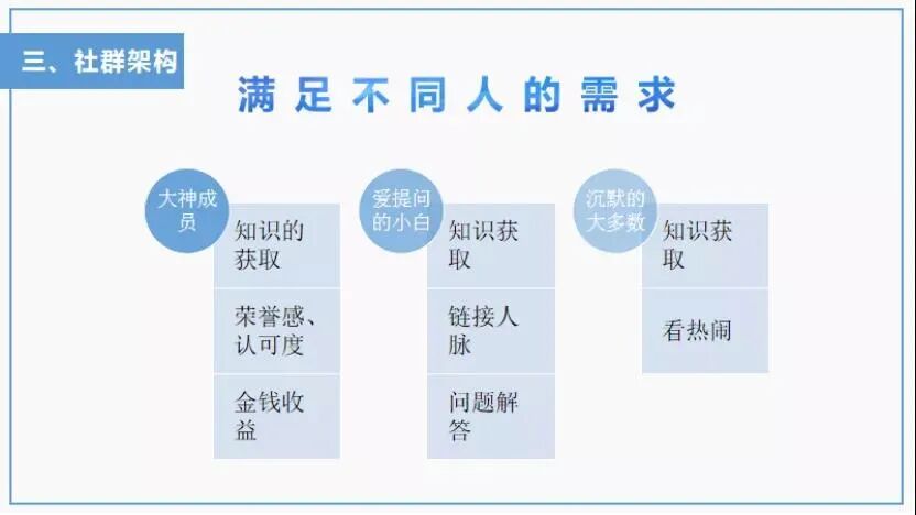 通过对他们这四种人的需求分析发现,做好一个社群运营最核心的就是要搞定大神成员。只有把他们搞定了,小白的提问就有人解答,沉默的大多数也可以在聊天记录中学到知识了,群主的群也就运营起来了。