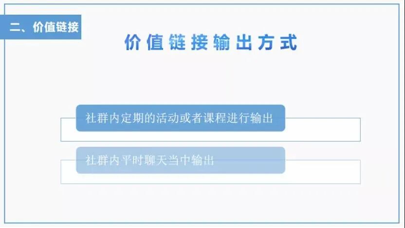 当社群里有了价值,大家也才会珍惜这个群,也会时不时的出来活跃。那么,价值链接输出有哪些方式呢?通常来说,有两种方式: